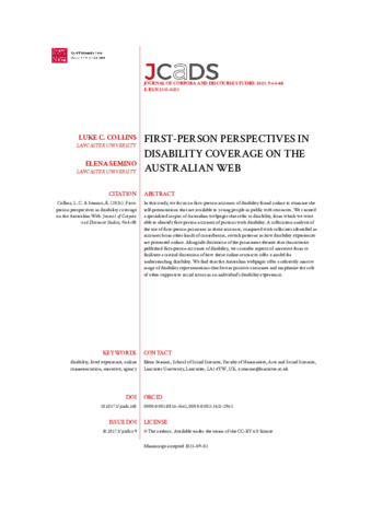 In this study, we focus on first-person accounts of disability found online to examine the self-presentations that are available to young people in public web resources. We describe the procedures for curating a specialised corpus of Australian webpages that refer to disability, from which we were able to identify first-person accounts of persons with disability. A collocation analysis of the use first-person pronouns in accounts from persons with disability, compared with collocates identified in accounts from other kinds of contributor, reveals patterns in how disability experiences are presented online. Alongside discussion of the prominent themes that characterise published first-person accounts of disability, we consider aspects of narrative form to facilitate a critical discussion of how these online resources offer a model for understanding disability. We find that the Australian webpages offer a relatively narrow range of disability representations that favour positive outcomes and emphasise the role of other supportive social actors in an individual’s disability experience.