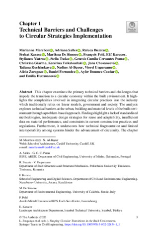 This chapter examines the primary technical barriers and challenges that impede the transition to a circular economy within the built environment. It highlights the complexities involved in integrating circular practices into the industry which traditionally relies on linear models, government and society. The analysis explores technical barriers at the urban, building and material levels of the built environment through a problem-based approach. Findings highlight a lack of standardized methodologies, inadequate design strategies for reuse and adaptability, insufficient data on material performance, and constraints in current construction practices and regulations. Furthermore, it underscores how technical fragmentation and limited interoperability among systems hinder the advancement of circularity. The chapter also explores the potential benefits of digitalization, design for disassembly, and building information modelling (BIM) as a means to address these challenges. Ultimately, it emphasizes the need for coordinated efforts among stakeholders, supported by robust regulatory frameworks and innovation, to effectively implement circular economy principles in the construction industry.