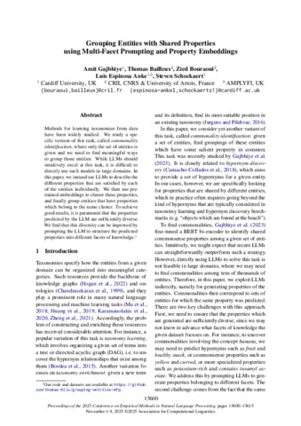 Grouping entities with shared properties using multi-facet prompting and property embeddings.