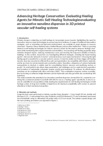 | De Nardi, Cristina and Ziegenbalg, Gerald 2025. Advancing heritage conservation: evaluating healing agents for mimetic self-healing technologies [Abstract]. Presented at: 7th Historic Mortars Conference (HMC 2025), Padova, Italy, 2-4 September 2025. 7th Historic Mortars Conference (HMC 2025), Padova. Rome: Edizioni Quasar, pp. 503-505. |