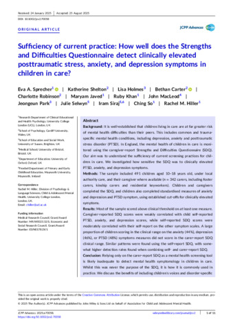 Sprecher, Eva A., Shelton, Katherine ORCID: https://orcid.org/0000-0002-1311-5291, Holmes, Lisa, Carter, Bethan, Robinson, Charlotte, Javed, Maryam, Khan, Ruby, MacLeod, John, Park, Jeongeun, Selwyn, Julie, Siraj, Iram, So, Ching and Hiller, Rachel M. 2025. Sufficiency of current practice: How well does the Strengths and Difficulties Questionnaire detect clinically elevated posttraumatic stress, anxiety, and depression symptoms in children in care? JCPP Advances , e70058. 10.1002/jcv2.70058