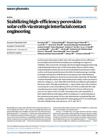 Stabilizing high-efficiency perovskite solar cells via strategic interfacial contact engineering.