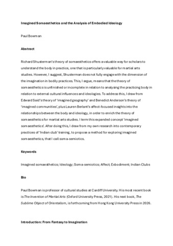 Richard Shusterman’s theory of somaesthetics offers a valuable way for scholars to understand the body in practice, one that is particularly valuable for martial arts studies. However, I suggest, Shusterman does not fully engage with the dimension of the imagination in bodily practices. This, I argue, means that the theory of somaesthetics is unfinished or incomplete in relation to analysing the practicing body in relation to external cultural influences and ideologies. To address this, I draw from Edward Said’s theory of ‘imagined geography’ and Benedict Anderson’s theory of ‘imagined communities’, plus Lauren Berlant’s affect-focused insights into the relationships between the body and ideology, in order to enrich the theory of somaesthetics for martial arts studies. I term this expanded concept ‘imagined somaesthetics’. After doing this, I draw from my own research into contemporary practices of ‘Indian club’ training, to propose a method for exploring imagined somaesthetics, that I call soma-semiotics.