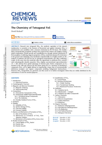 Research into tetragonal FeSm, the synthetic equivalent of the mineral mackinawite, is currently at the frontiers of theoretical and applied chemistry. FeSm is stoichiometric and crystallizes with a structure dominated by Fe–Fe layers. The familiar black, nanoparticulate precipitate develops from aqueous FeS clusters and displays varying initial compositions. Particle growth and crystallization are through oriented attachment of FeS nanoplates. Conflicting magnetic properties of FeSm result from itinerant Fe d-electrons in the ground state displaying some localization experimentally. It is highly sensitive to the method of synthesis and this has led to widespread irreproducible, and often conflicting, results. At the same time this sensitivity offers the opportunity to synthesize FeSm varieties with technologically valuable properties. FeSm displays unconventional superconductivity (Tc ∼ 5K) derived from spatial anisotropy of electron pairs. Exotic compounds can be inserted in the vdW gap between the FeS layers giving rise to a spectrum of interlayered compounds. FeSm can be highly efficient in sequestering a large array of environmentally deleterious inorganic and organic compounds including halogenated hydrocarbons. However, FeSm nanoparticles are genotoxic and this needs to be further investigated before they are widely distributed in the environment or used for medical purposes.