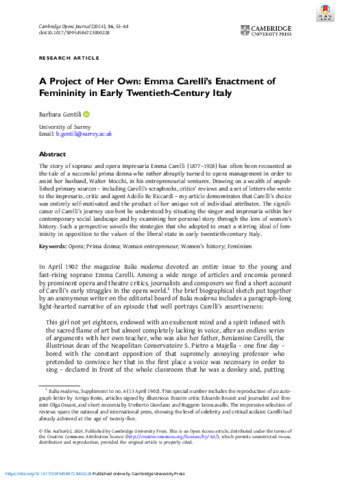 The story of soprano and opera impresaria Emma Carelli (1877–1928) has often been recounted as the tale of a successful prima donna who rather abruptly turned to opera management in order to assist her husband, Walter Mocchi, in his entrepreneurial ventures. Drawing on a wealth of unpublished primary sources – including Carelli's scrapbooks, critics’ reviews and a set of letters she wrote to the impresario, critic and agent Adolfo Re Riccardi – my article demonstrates that Carelli's choice was entirely self-motivated and the product of her unique set of individual attributes. The significance of Carelli's journey can best be understood by situating the singer and impresaria within her contemporary social landscape and by examining her personal story through the lens of women's history. Such a perspective unveils the strategies that she adopted to enact a stirring ideal of femininity in opposition to the values of the liberal state in early twentieth-century Italy.