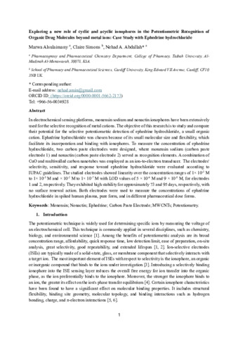 Exploring a new role of cyclic and acyclic ionophores in the potentiometric recognition of organic drug molecules beyond metal ions: Case study with ephedrine hydrochloride.