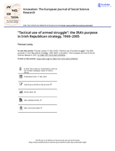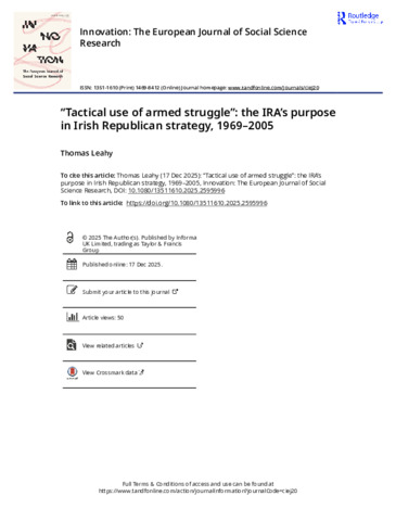 Between 1969 and 1997, the Irish Republican Army (IRA) fought against British rule in Northern Ireland. Some scholars suggest Republicans saw the IRA as vital to achieving Irish unification. They argue that the IRA only ended their campaign because the organization faced a trajectory of decline by the 1990s. Others agree that the IRA was utilised by Republicans to achieve unity but conclude that the IRA faced a stalemate by the 1990s and accepted a political compromise. Using a range of sources, I argue Irish Republican leaders always viewed the IRA as a tactic to get its opponents to negotiate and provide concessions towards its objectives, most crucially securing the principle of all-Ireland self-determination in some form. The IRA’s role in Republican strategy fluctuated in importance. Between 1969 and 1975, it was the main method used to try to get Republicans into talks and to try to achieve self-determination. After 1975, Republican leaders still believed the IRA was required to pressurise the British Government back into negotiations. But a political mandate was added to ensure their opponents would agree to and implement a political settlement inclusive of the principle of self-determination once IRA violence ceased. This ‘Armalite and Ballot Box’ strategy lasted until 1997. I also demonstrate how recent archival releases show the IRA’s weapons remained in the background until 2005 in case the British Government and Unionists delayed implementing reforms agreed in the peace deal. During the IRA’s 1994 ceasefire, they discussed ‘TUAS’. Some commentators believe it meant the ‘Tactical Use of Armed Struggle’. This phrase best explains the IRA’s role in Republican strategy from 1969 to 2005. This case study reveals a pragmatism behind the leadership of some non-state armed groups.