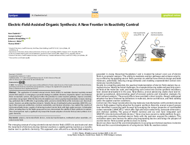 The application of oriented external electric fields (OEEFs) to modulate chemical reactivity-termed electric field catalysis-is emerging as a powerful strategy in synthetic chemistry. Inspired by nature's use of internal fields in enzymatic systems, this approach offers the potential to control reaction pathways, improve selectivity, and reduce energy input. While the theoretical foundations are robust, practical implementation remains challenging, particularly due to difficulties in generating stable, precisely oriented fields at the molecular scale.Recent advances, however, are addressing these obstacles. Notably, the use of multiwalled carbon nanotubes (MWCNTs), owing to their nanoscale architecture, electrical conductivity, and chemical robustness, has enabled the creation of electromicrofluidic devices capable of delivering localized electric fields with high spatial precision.Collaborative efforts, including those by the Matile group and our own, have demonstrated the viability of these platforms in catalysis. These developments mark a significant step toward the broader adoption of electric fieldassisted synthesis in organic chemistry.