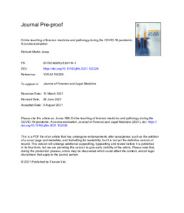 | Jones, Richard Martin 2021. Online teaching of forensic medicine and pathology during the COVID-19 pandemic: A course evaluation. Journal of Forensic and Legal Medicine 83 , 102229. 10.1016/j.jflm.2021.102229 |