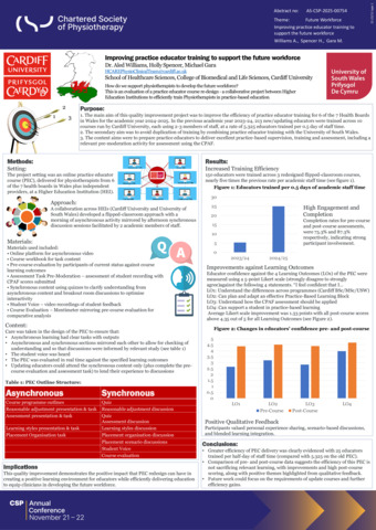 | Williams, Aled, Spencer, Holly and Gara, Michael 2025. Improving practice educator training to support the future workforce. Presented at: Chartered Society of Physiotherapy National Conference 2025, Nepwort, Wales, 21-22 November 2025. |