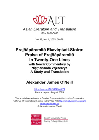 | O'Neill, Alexander 2025. Prajñāpāramitā Ekaviṃśati-Stotra: praise of Prajñāpāramitā in twenty-one lines with Newar commentary by Niṣṭhānanda Vajrācārya. A study and translation. Asian Literature and Translation (ALT) 12 (1) , pp. 30-79. 10.18573/alt.79 |