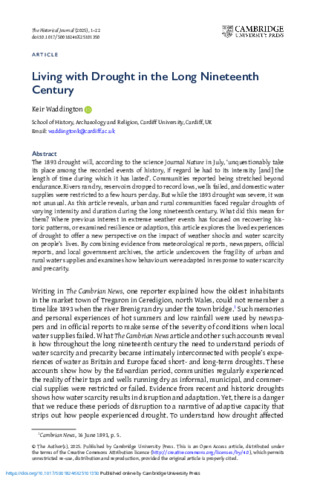 The 1893 drought will, according to the science journal Nature in July ‘unquestionably take its place among the recorded events of history, if regard be had to its intensity [and] the length of time during which it has lasted’. Communities reported being stretched beyond endurance. Rivers ran dry, reservoirs dropped to record lows, wells failed, and domestic water supplies were restricted to a few hours per day. But while the 1893 drought was severe, it was not unusual. As this article reveals, urban and rural communities faced regular droughts of varying intensity and duration during the long nineteenth century. What did this mean for them? Where previous interest in extreme weather events has focused on recovering historic patterns, or examined resilience or adaption, this article explores the lived experiences of drought to offer a new perspective on the impact of weather shocks and water scarcity on people’s lives. By combining evidence from meteorological reports, newspapers, official reports, and local government archives, the article undercovers the fragility of urban and rural water supplies and examines how behaviours were adapted in response to water scarcity and precarity.