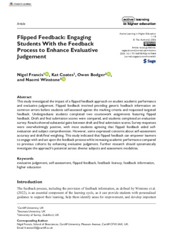 This study investigated the impact of a flipped feedback approach on student academic performance and evaluative judgement. Flipped feedback involved providing generic feedback information on common errors before students self-assessed against the marking criteria and requested targeted feedback. Undergraduate students completed two coursework assignments featuring flipped feedback. Draft and final submission scores were compared, and students completed an evaluation survey. Results showed substantial gains between draft and final submission scores. Survey responses were overwhelmingly positive, with most students agreeing that flipped feedback aided self-evaluation and subject comprehension. However, some expressed concerns about self-assessment accuracy and draft/final weighting. This study indicated that flipped feedback can empower learners to engage with and act upon the feedback process while increasing academic performance compared to previous cohorts by enhancing evaluative judgement. Further research should systematically investigate the approach’s potential across diverse subjects and assessment modalities.