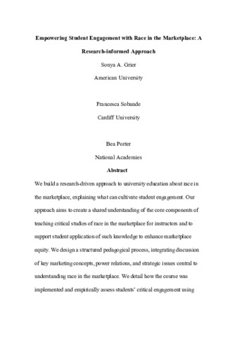 We build a research-driven approach to university education about race in the marketplace, explaining what can cultivate student engagement. Our approach aims to create a shared understanding of the core components of teaching critical studies of race in the marketplace for instructors and to support student application of such knowledge to enhance marketplace equity. We design a structured pedagogical process, integrating discussion of key marketing concepts, power relations, and strategic issues central to understanding race in the marketplace. We detail how the course was implemented and empirically assess students’ critical engagement using text analysis and a pre-and post-course survey. Overall, we provide guidance for educators who desire to address issues of race in their curriculum and classrooms – whether as a semester-long course or through specific course modules.