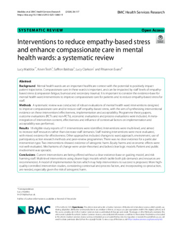 Mental health wards are an important healthcare context with the potential to positively impact patient trajectories. Compassionate care in these wards is important, and can be impacted by staff levels of empathy-based stress (compassion fatigue, burnout and secondary trauma). It is important to consider the evidence-base for mental health ward interventions to improve compassionate care for patients and to reduce empathy-based stress for staff. A systematic review was conducted of robust evaluations of mental health ward interventions designed to improve compassionate care and/or reduce staff empathy-based stress, with the aim of synthesising interventional evidence on these interventions' effectiveness, implementation and acceptability. Programme theory papers, outcome evaluations (RCTs and non-RCTs), economic evaluations and process evaluations were included. A meta-integration of intervention content, effectiveness and influence of contextual factors on implementation and acceptability was performed. 18 eligible study reports of 11 interventions were identified. Interventions were multi-level, and aimed to increase staff resources rather than decrease staff demands. Staff training interventions were most evaluated, with mixed evidence for effectiveness. Other approaches included changes to ward approach, environment, use of participatory action research methods and peer-review programmes. There was no clear evidence for a particular intervention type. Two interventions showed evidence of iatrogenic harm. Equity harms and economic effects were not well-evaluated. Mechanisms of change were under-theorised and lacked clear logic models. Patient and public involvement was sporadic. Current interventions are being offered without a clear evidence-base or guiding model, and risk harming staff. Multi-level interventions using clearer logic models which tackle both job demands and resources are recommended. A model of implementation factors which may help interventions to succeed is proposed. More high-quality controlled intervention studies, considering contextual and process factors, and incorporating co-production, are needed, especially given the risk of iatrogenic harm. [Abstract copyright: © 2025. The Author(s).]