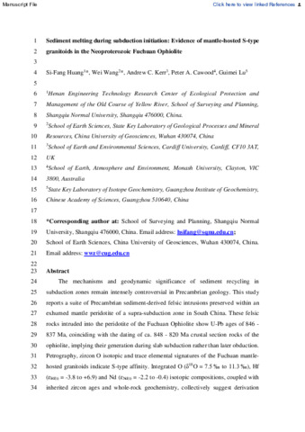 Sediment melting during subduction initiation: Evidence of mantle-hosted S-type granitoids in the Neoproterozoic Fuchuan Ophiolite.