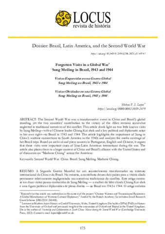 The Second World War was a transformative event in China and Brazil’s global standing, yet the two countries’ contribution to the victory of the Allies remains somewhat neglected in traditional narratives of the conflict. This article sheds light on two little known visits by Song Meiling — wife of Chinese leader Chiang Kai-shek and a key political and diplomatic actor in her own right — to Brazil in 1943 and 1944. The article highlights the importance of Song in China’s wartime connections to South America in the 1940s and analyses the media coverage of her Brazil trips. Based on archival and press sources in Portuguese, English and Chinese, it argues that these visits were important cases of Sino-Latin American interactions during the war. The article also places them in a larger context of China and Brazil’s alliance with the United States and of discourses on “Madame Chiang” across the Americas.
