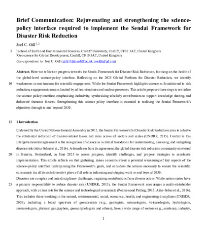 Brief communication: Rejuvenating and strengthening the science-policy interface required to implement the Sendai Framework for Disaster Risk Reduction.