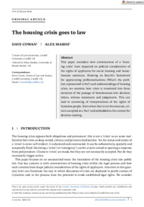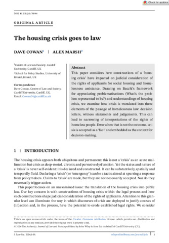 This paper considers how constructions of a "housing crisis" have impacted on judicial consideration of the rights of applicants for social housing and homelessness assistance. Drawing on Bacchi’s framework for appreciating problematisations (“What’s the problem represented to be?), and understandings of housing crisis, we examine how crisis is translated into three elements of the passage of homelessness law: decision-letters, witness statements, and judgments. This can lead to narrowing of interpretations of the rights of homeless people. Even when that is not the outcome, crisis is accepted as a “fact” and embedded as the context for decision-making.
