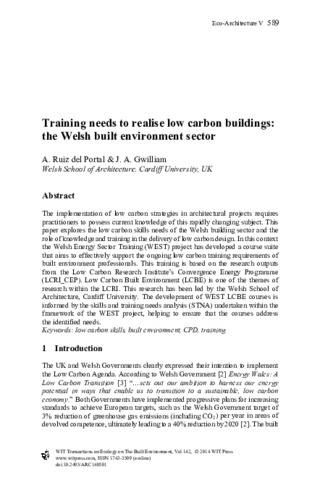 The implementation of low carbon strategies in architectural projects requires practitioners to possess current knowledge of this rapidly changing subject. This paper explores the low carbon skills needs of the Welsh building sector and the role of knowledge and training in the delivery of low carbon design. In this context the Welsh Energy Sector Training (WEST) project has developed a course suite that aims to effectively support the ongoing low carbon training requirements of built environment professionals. This training is based on the research outputs from the Low Carbon Research Institute’s Convergence Energy Programme (LCRI_CEP). Low Carbon Built Environment (LCBE) is one of the themes of research within the LCRI. This research has been led by the Welsh School of Architecture, Cardiff University. The development of WEST LCBE courses is informed by the skills and training needs analysis (STNA) undertaken within the framework of the WEST project, helping to ensure that the courses address the identified needs.