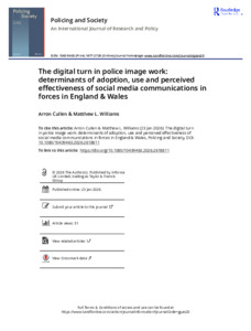 This paper examines police use of social media platforms in England and Wales. Based on a novel linked dataset consisting of survey data from 38 forces, police Twitter communications from all 43 forces, and qualitative interviews with corporate communications staff, analysis shows variation in patterns of adoption and usage, and perceptions of effectiveness by a range of organisational and policy factors. Drawing on the notion of ‘image work’, the findings indicate that police communications have gone through significant changes over the past decade, shifting from professionalisation to the digitalisation of police image work. The paper concludes that while police forces continueto be cautious about fully adopting social media, digital channels are becoming increasingly central for operational policing and enhancing customer service-related duties.