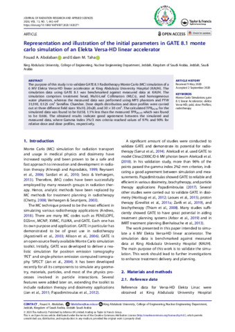 The purpose of this study is to validate GATE 8.1 Radiotherapy Monte Carlo (MC) simulation of a 6 MV Elekta Versa-HD linear accelerator at King Abdulaziz University Hospital (KAUH). The simulation data using GATE 8.1 was benchmarked against measured data at KAUH. The simulation comprises treatment head, Multi-Leaf Collimators (MLCs), and homogeneous water phantom, whereas the measured data was performed using MP3 phantom and PTW 31,010, 0.125 cm3 Semiflex Chamber. Dose depth distribution and dose profiles were carried out at three different field sizes 10x10, 20x20, and 30 × 30 cm2. The calculated TPR20,10 for the simulated data was found to be 0.658, 1.1% less than the measured TPR20,10 which was found to be 0.666. The obtained results indicate good agreement between the simulated and measured data, where Gamma Index 3%/3 mm criteria reached values of 97% and 90% for relative dose and dose profiles, respectively.