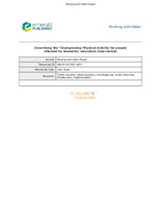 Purpose The benefits of physical activity for people with dementia are well researched; however, this population experiences high levels of physical inactivity. An evidence-based online education intervention was developed to address professional knowledge and confidence to facilitate and deliver physical activity opportunities for people with dementia and their unpaid carers. This paper aims to systematically describe the “Championing Physical Activity for people affected by dementia” (CPA) intervention. Design/methodology/approach The Template for Intervention Description and Replication checklist (TIDieR) was used as a best practice guideline for intervention description by reporting key intervention components to support replication and future research. Findings TIDieR provided a standardised and systematic way to describe CPA. Key components of CPA were a structured approach to online learning, live sessions with a lecturer in dementia studies and asynchronous resources/activities to scaffold learning. Content included key concepts (e.g. citizenship and leisure), implementation determinants (e.g. barriers and facilitators) and processes/strategies (e.g. planning and adapting) to design and deliver physical activity sessions with people affected by dementia. Delivered online over a six-week period, CPA was acceptable for diverse practitioners that may engage people in physical activity. Originality/value This study provides a full description of the CPA intervention, which may be a feasible and effective way to address the knowledge gap in dementia education around physical activity.