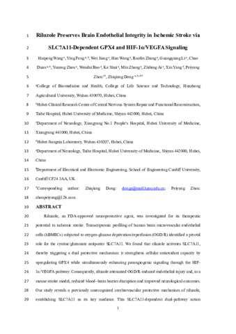 Riluzole preserves brain endothelial integrity in ischemic stroke via SLC7A11-dependent GPX4 and HIF-1α/VEGFA signaling.
