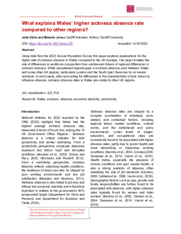 Using data from the 2023 Annual Population Survey this paper explores explanations for the higher rate of sickness absence in Wales compared to the UK average. The paper isolates the role of differences in workforce composition from unobserved drivers of regional differences in sickness absence. While unexplained regional gaps in sickness absence exist between Wales and some other UK regions, particularly London and the South East, these are by no means universal. In most cases, after accounting for differences in the characteristics of jobs known to influence absence, sickness absence rates in Wales are similar to other UK regions.