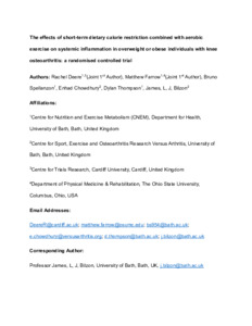 The effects of short-term dietary calorie restriction combined with aerobic exercise on systemic inflammation in overweight or obese individuals with knee osteoarthritis: a randomised controlled trial.