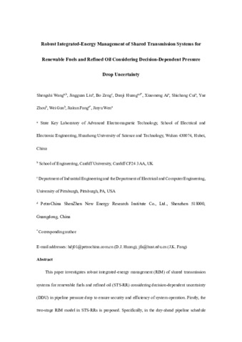Robust integrated-energy management of shared transmission systems for renewable fuels and refined oil considering decision-dependent pressure drop uncertainty.