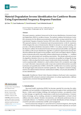 This paper presents a stochastic framework for the inverse identification of structural material degradation (SMD) in cantilever beams. The method combines the Karhunen–Loéve (KL) expansion for the efficient parameterisation of spatially varying material decay with experimental Frequency Response Function (FRF) data within a Bayesian inference scheme. This approach employs a low-dimensional spectral parameterisation via the KL expansion, which mitigates the curse of dimensionality inherent in element-wise model updating, and provides a full-field probabilistic description of SMD. A two-phase constraint strategy was developed to address the fundamental tension between physical plausibility and algorithmic stability of the inverse identification algorithm: (1) physical regularisation during identification stabilises the ill-posed inverse problem, and (2) post-convergence selective regularisation eliminates physically impossible stiffness enhancements (exceeding 1.1 × baseline) that arise from measurement and modelling uncertainties. This phased approach prevents the algorithm distortion that occurs when constraints are applied too stringently during iteration, while ensuring final results respect fundamental physical principles. The framework is experimentally validated on a steel cantilever beam with a symmetric open-edge cut. Laser vibrometry measurements under swept-sine excitation demonstrate successful localisation and quantification of SMD, with the 95% credible interval accurately capturing the damaged region after physical constraint application. The adaptive constraint strategy resolves the delicate balance between mathematical stability and physical plausibility in inverse identification.