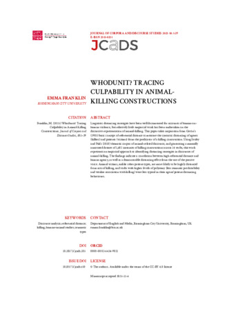 Linguistic distancing strategies have been well documented for accounts of human-on-human violence, but relatively little empirical work has been undertaken on the discursive representation of animal-killing. This paper takes inspiration from Givón’s (1983) basic concept of referential distance to measure the syntactic distancing of agents (killers) and patients (victims) from the predicator of a killing construction. Using Sealey and Pak’s (2018) thematic corpus of animal-related discourse, and generating a manually annotated dataset of 1,682 instances of killing constructions across 14 verbs, this work represents an empirical approach to identifying distancing strategies in discourses of animal-killing. The findings indicate a correlation between high referential distance and human agency, as well as a demonstrable distancing effect from the use of the passive voice. Animal victims, unlike other patient types, are more likely to be highly distanced from acts of killing, and verbs with higher levels of polysemy (less semantic predictability and weaker association with killing) were less typical in their agent/patient distancing behaviours.