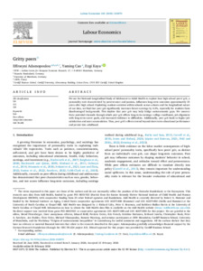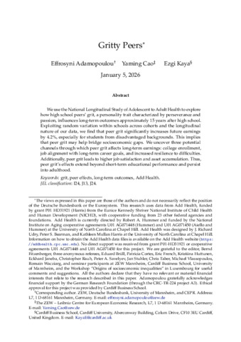 We use the National Longitudinal Study of Adolescent to Adult Health to explore how high school peers’ grit, a personality trait characterized by perseverance and passion, influences long-term outcomes approximately 15 years after high school. Exploiting random variation within schools across cohorts and the longitudinal nature of our data, we find that peer grit significantly increases future earnings by 4.2%, especially for students from disadvantaged backgrounds. This implies that peer grit may help bridge socioeconomic gaps. We uncover three potential channels through which peer grit affects long-term earnings: college enrollment, job alignment with long-term career goals, and increased resilience to difficulties. Additionally, peer grit leads to higher job satisfaction and asset accumulation. Thus, peer grit’s effects extend beyond short-term educational performance and persist into adulthood.