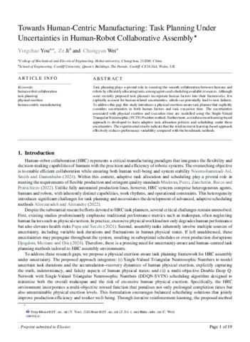 Towards human-centric manufacturing: Task planning under uncertainties in human–robot collaborative assembly.