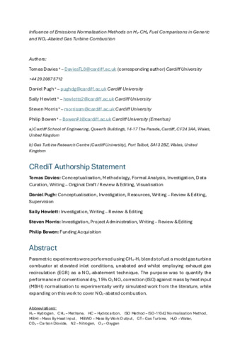 Influence of emissions normalisation methods on H2–CH4 fuel comparisons in generic and NOx-Abated gas turbine combustion.