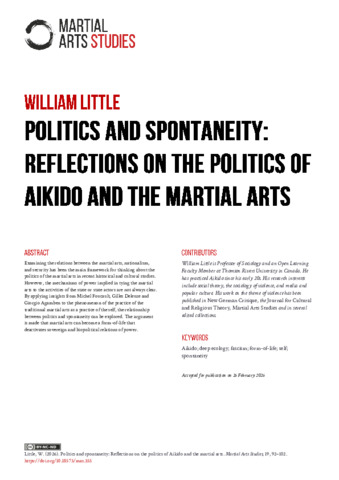 Examining the relations between the martial arts, nationalism, and security has been the main framework for thinking about the politics of the martial arts in recent historical and cultural studies. However, the mechanisms of power implied in tying the martial arts to the activities of the state or state actors are not always clear. By applying insights from Michel Foucault, Gilles Deleuze and Giorgio Agamben to the phenomenon of the practice of the traditional martial arts as a practice of the self, the relationship between politics and spontaneity can be explored. The argument is made that martial arts can become a form-of-life that deactivates sovereign and biopolitical relations of power.