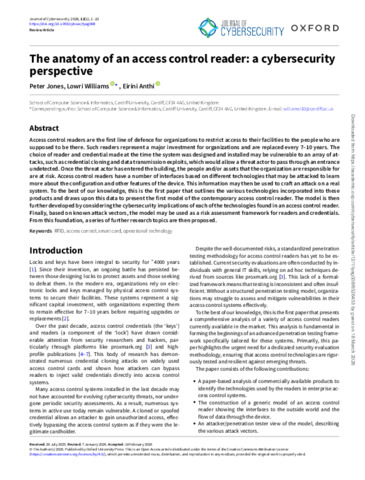 Access control readers are the first line of defence for organizations to restrict access to their facilities to the people who are supposed to be there. Such readers represent a major investment for organizations and are replaced every 7–10 years. The choice of reader and credential made at the time the system was designed and installed may be vulnerable to an array of attacks, such as credential cloning and data transmission exploits, which would allow a threat actor to pass through an entrance undetected. Once the threat actor has entered the building, the people and/or assets that the organization are responsible for are at risk. Access control readers have a number of interfaces based on different technologies that may be attacked to learn more about the configuration and other features of the device. This information may then be used to craft an attack on a real system. To the best of our knowledge, this is the first paper that outlines the various technologies incorporated into these products and draws upon this data to present the first model of the contemporary access control reader. The model is then further developed by considering the cybersecurity implications of each of the technologies found in an access control reader. Finally, based on known attack vectors, the model may be used as a risk assessment framework for readers and credentials. From this foundation, a series of further research topics are then proposed.