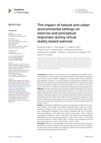 The impact of natural and urban environmental settings on exercise and perceptual responses during virtual reality-based exercise.