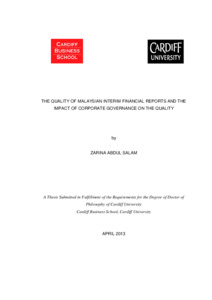 This thesis examines the quality of Malaysian interim financial reports (interims) and the impact of corporate governance on the quality. The quality of interims is proxied by timeliness; compliance with the FRS 134, Interim Financial Reporting; compliance with the Bursa Malaysia Listing Requirements (BMLR); and comparability of profit and loss items when they were originally issued and placed in the next year’s corresponding quarter and comparison against the annual reports. Two methods are used to assess the quality of interims namely dichotomous and continuous. The first method provides one score for each proxy if it is in compliance and zero score otherwise and the latter method use the actual values. This thesis has found that the quality of interims is remarkably high for each proxy if a dichotomous method is used and it is moderate for continuous method. The lower quality is due to timeliness and comparability, because Malaysian companies are inclined to publish interims towards the end of the allowable period and most of the interims’is remarkably high for each proxy if a dichotomous method is used and it is moderate for continuous method. The lower quality is due to timeliness and comparability, because Malaysian companies are inclined to publish interims towards the end of the allowable period and most of the interims’ profit and loss items are not comparable. Consequently, compliance with the FRS 134 contributes the most to the quality of interims, while comparability contributes the least. Corporate governance is proxied by the frequency of directors’ meetings, independence, financial literacy, corporate governance expertise, and the ethnicity of directors. This thesis has found that all corporate governance variables are associated with the quality of interims except independence and corporate governance expertise. Despite these associations, multivariate regression reveals that the impact of corporate governance on the quality of interims is very low. These findings have implications for several users such as Malaysian regulatory bodies to ensure that PLC complied with the interim reporting standards; policymakers to ensure there is no misapplication of provision of accounting standards; protect shareholders to appoint appropriate composition of directors; and academicians for future research.