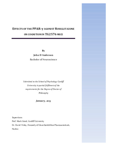 Effects of the PPAR-γ agonist rosigliatazone on cognition in TG2576 mice.