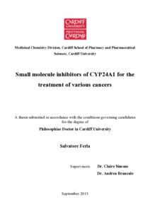 In the last three decades vitamin D, or calcitriol, has been found to have important anticancer role in different cancer types. Unfortunately, a therapy using calcitriol remains a challenge due to increased drug resistance as a consequence of the up-regulation of CYP24A1, which metabolises and inactivates calcitriol. Moreover, the hypercalcaemia associated with an elevated dose of calcitriol does not allow the use of vitamin D at a high concentration. Analogues of calcitriol have enhanced anti-tumour activity, reducing the calcaemic undesired effect. The use of CYP24A1 selective inhibitors could be the appropriate strategy to increase the lifetime and thereby! the anti-cancer functions of calcitriol and its derivatives. Consequently, the aim of this project is to develop new, potent and selective inhibitors of CYP24A1 that could be used in the treatment of different types of cancer in order to enhance endogenous vitamin D levels and favour its anti-tumour activity. Through molecular modelling studies, a new CYP24A1 homology model has been prepared and the active site has been characterised examining the disposition of (R)-VID400, a CYP24 inhibitor, (E)-N-(2-(1H-imidazol-1-yl)2-phenylethyl)-4-styrylbenzamide (MCC165), a compound previously synthesised in our laboratory that showed a potent CYP24A1 inhibitory activity (IC50= 0.3μM), and the natural substrate calcitriol. Different series of potential CYP24A1 inhibitors were designed in order to mimic completely the calcitriol disposition in the binding pocket and to interact with the haem iron of the enzyme catalytic site. For each series a synthetic pathway was developed. The synthesis was followed by a CYP24A1/CYP27B1 inhibition assay. All the compounds occupy the same hydrophobic tunnel as calcitriol and access the active site through the same channel. Moreover the substituents in the lateral chain bind directly to the haem iron via a lone pair of electrons. The different syntheses were obtained after several optimisations of reactions and routes. The CYP24A1/CYP27B1 inhibitory activity (IC50) using a cell-free assay and the value of the Ki (dissociation constant) of the different series of compounds, compared with ketoconazole (Ki= 0.030 μM, IC50= 0.47 μM) as the standard, were evaluated. Selectivity of CYP24A1 over CYP27B1 was also calculated. New potent CYP24A1 inhibitors were found.!Selectivity gave a range from poor to moderate results with selectivity improved in some case compared with ketoconazole (selectivity: 1.6).