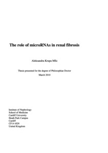 This thesis examines the role of microRNAs in renal fibrosis. MicroRNAs constitute a large family of approximately 22-nucleotide-long non-coding RNAs, that in animal cells regulate gene expression posttranscriptionally. At the start of the project, microRNAs were emerging as potentially important factors in various physiological and pathological processes however, there was very little known about their expression and function in the kidney, in particular in tubulointerstitial fibrosis. In this thesis, global microRNA expression has been analysed in vitro in proximal tubular epithelial cells, and in vivo in formalin-fixed, paraffin-embedded kidney biopsy samples from patients with diabetic nephropathy. Among microRNAs altered by profibrotic stimuli, the greatest difference has been found in expression ofmiR-192, which is downregulated in severe diabetic nephropathy. Further examination of miR-192 in kidney biopsy samples has revealed that its expression correlates well with renal function and inversely correlates with fibrosis. A possible function of miR-192 has been then studied in vitro in proximal tubular epithelial cells. It has been found that treatment of the cells with the profibrotic cytokine TGF-β1 downregulates miR-192. Moreover, manipulation of miR-192 expression has shown that miR-192 is involved in E-cadherin regulation. The mechanism of that regulation has been investigated, pointing to two transcriptional repressors of E-cadherin, ZEB1 and ZEB2, as direct targets of miR-192. The presented data suggest that, in the kidney, miR-192 may prevent epithelial-to-mesenchymal transition, known to contribute to renal fibrosis. In parallel, global microRNA downregulation in proximal tubular epithelial cells has been attempted. However, knockdown of Dicer or TRBP, proteins involved in microRNA processing, has not been sufficient to induce changes in microRNA expression. The possible explanations have been discussed. Finally, microRNA role in direct regulation of TGF-β1 synthesis has been investigated. In particular, human microRNAs similar to viral hsv-miR-LAT, reported to directly target TGF-β1 mRNA, have been tested.