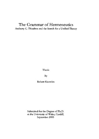 The grammar of hermeneutics: Anthony C. Thistleton and the search for a unified theory.