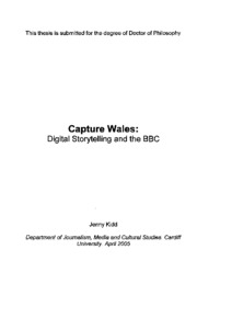 The research shows that the actuality of being 'captured' as a part of Capture Wales is neither standard to all participants, nor easy to evaluate in terms of measures of success. Most participants display a positive attitude to the process that is often explained by the perceived therapeutic nature of the workshop, and as a result of the experience, many participants enjoy a relationship with technology that is vastly advanced from their prior use. But on the whole the project has not changed Wales into a nation of Digital Storytellers. The limited numbers of people involved, coupled with the fairly limited space allowed by the BBC for the stories' display mean that the true public service'ness' of the project must be called into question.