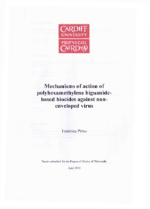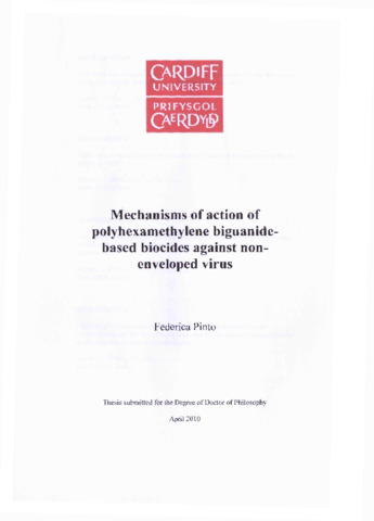 Human viral pathogens place a serious threat on the healthcare system. Adequate and efficient disinfection procedures minimise the incidence of surface contamination and viral disease transmission. Biocide type, environmental conditions and viral characteristics e.g. presence of envelope influence the disinfection effectiveness. Thus, understanding the mechanisms of virucidal action is essential for improving disinfection efficacy. PHMB has a wide range of antimicrobial activities, but its action against viruses has been mostly tested on enveloped viruses, which appeared to be inactivated. This project aimed at understanding the mechanisms of action of two PHMB-based biocides, VANTOCIL TG and COSMOCILIMCQ, against non-enveloped viruses including the bacteriophages MS2 and F116 used as model viruses, and the human Adenovirus type5. Biocides were tested in a suspension test at different conditions. Hydrophobicity tests, SDS-PAGE, DNA analysis, dynamic light scattering and transmission electron microscopy were performed. Suspension tests at 20 °C showed that PHMBs at 800 ppm reduced MS2 and Ad5 by 90. Higher reduction was achieved against Fl 16 99. Times of exposure did not increase the activity, whereas temperature had a great effect. At 30 °C 99.99 of MS2 was inactivated after 10 min the efficacy against Ad5 was also enhanced, but to minor extent. Despite a modest activity, PHMB interacted with the viral capsid producing damage which was very specific against Ad5. Viral aggregation played a key role in limiting virucidal efficacy of PHMB, especially concerning MS2. It is likely that the observed capsid damage caused the inactivation. However, the hypothesis of domain formation by PHMB and thus the inhibition of the virus-host interaction cannot be ruled out. The mechanism of binding PHMB molecules to the viruses was highly cooperative and occurred through first electrostatic and then hydrophobic forces. Concluding, it is the first time that PHMB-based biocides were shown to interact with viral capsid resulting in virucidal activity against non-enveloped viruses. However, such activity is reduced by formation of viral aggregates. Results supported also the use of MS2 as a surrogate of human RNA non-enveloped viruses.